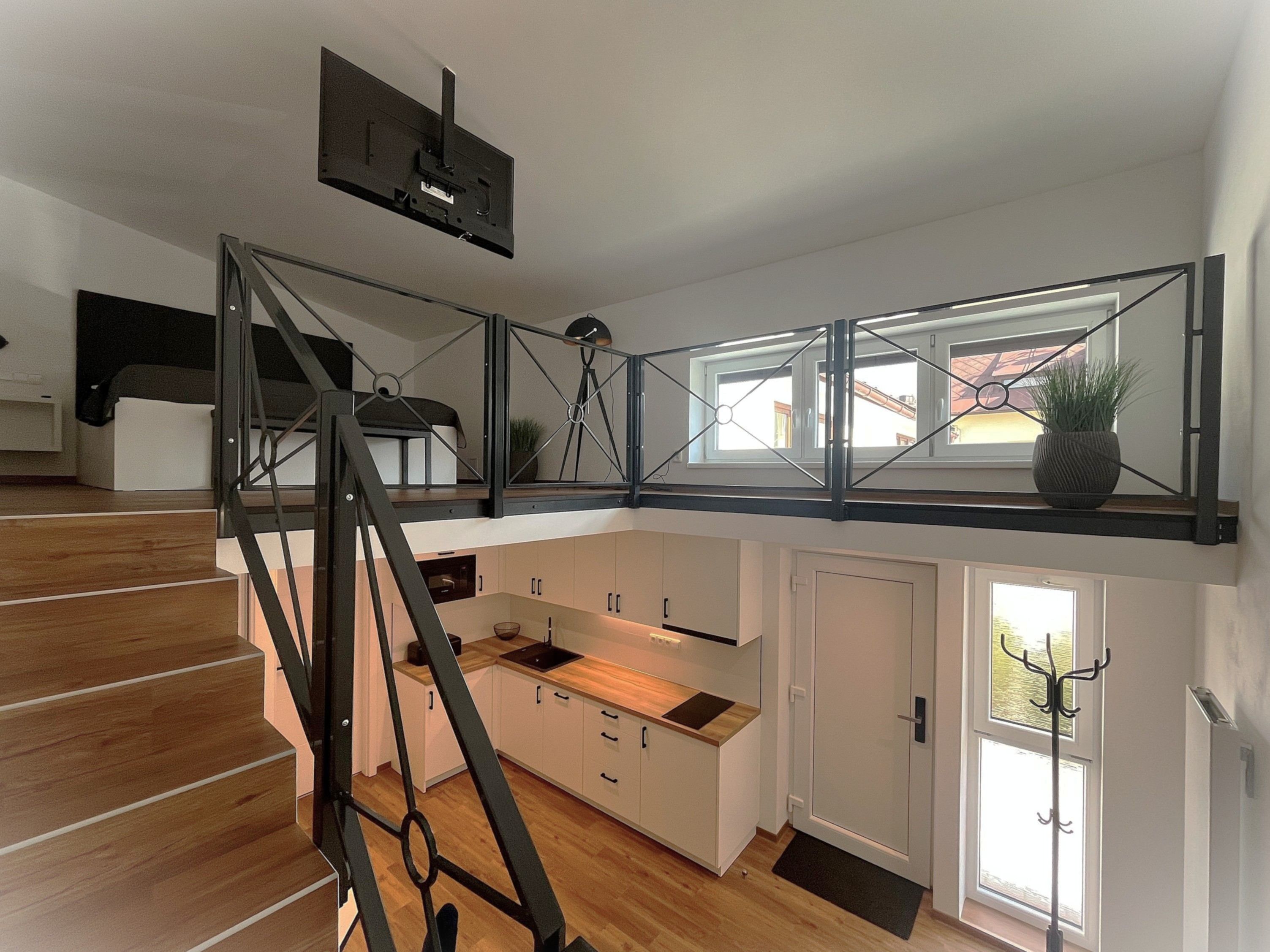 Prostorný a elegantně zařízený apartmán o velikosti 50 m² nabízí komfortní ubytování na jednom podlaží a dostatek prostoru pro ničím nerušený odpočinek. Apartmán tvoří vstupní předsíň s velkou šatní skříní a prostorná koupelna se sprchovým koutem. Součástí je také samostatná plně vybavená kuchyně, která poskytuje ideální zázemí pro pohodlnou přípravu vlastních jídel. Dominantou apartmánu je světlý obývací pokoj s velkou televizí, jídelním stolem a pohodlnou rozkládací sedací soupravou, kterou lze využít jako přistýlku. Součástí apartmánu je také samostatná ložnice s přímým vstupem na prostorný balkon, který nabízí příjemné místo pro ranní kávu i večerní odpočinek. Apartmán je ideální volbou pro hosty, kteří hledají prostorné a stylové ubytování s příjemným venkovním prostorem.
